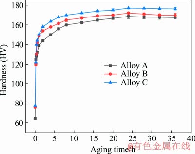 Figure 7 shows the variation of hardness with time during aging at 120 °C for the three alloys. It is obvious that the hardness values of the three alloys markedly increase during under-aging and decrease during over-aging. The hardness of Alloy C is higher than that of Alloys A and B. The initial hardness values are HV (64.9±1.3), (74.0±0.2) and (77.5±0.3) for Alloys A, B and C in ST state, respectively, and then increase to HV (168.7±2.5), (172.0±2.2) and (177.1±0.8) after artificial aging at 120 °C for 24 h. Moreover, the improvement of hardness by the addition of Sc and Zr affects the whole aging process, and the alloys are all in PA state after 24 h aging at 120 °C. Combined with the TEM images of the three alloys (Fig. 5), it can be inferred that minor additions of Sc and Zr do not retard and suppress the precipitation behavior of the aging precipitates.