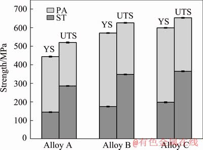 Figure 8 shows the tensile properties of alloys under different conditions. The yield strengths (YS) of ST Alloys A, B and C are about 145, 175 and 198 MPa, and the ultimate tensile strengths (UTS) are about 286, 348 and 365 MPa, respectively. Moreover, after T6-treatment, the YS of Alloys A, B and C increases by about 299, 369 and 401 MPa, and the UTS increases by about 234, 278 and 288 MPa, respectively. The UTS of the T6-treated base alloy improves by about 105 MPa with the addition of 0.1% Zr and by about 133 MPa with the addition of 0.07% Sc and 0.07% Zr. It can be inferred that the joint minor addition of Sc and Zr can more effectively enhance the mechanical properties than the minor addition of Zr only. Furthermore, the strengthening from Sc and Zr micro-alloying is independent from that by age hardening in the Al-Zn-Mg-Cu alloys.