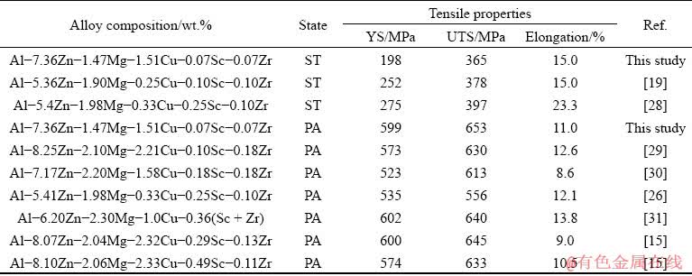 Table 2 Tensile properties of Al-Zn-Mg-Cu alloys with Sc and Zr additions at different states