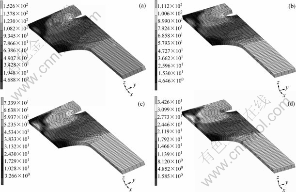 Fig.2 Distribution of tensile stress at different temperatures: (a) 473 K; (b) 523 K; (c) 573 K; (d) 673 K