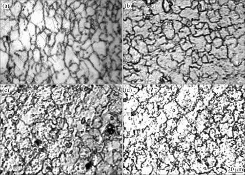 Fig.5 Microstructures of DRX of specimens deformed at different temperatures: (a) 473 K; (b) 523 K; (c) 573 K; (d) 673 K