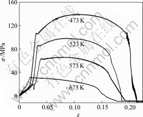 =0.25),通过有限元仿真得不同温度下拉伸应力分布(见图2)。从图2中可看出,不同温度下,AZ31镁合金拉伸过程中应力分布基本一致;且随着温度升高,应力值趋于下降,说明温度对材料变形抗力影响甚大。图2(d)中的应力最大处与图2(a)、(b)和(c)中的应力最大处有所不同,这说明随着温度升高,镁合金板材在变形过程软化现象明显。变形应力—应变曲线可更好地说明温度对变形过程材料软化的影响(见图3)。当变形温度为473 K时,镁合金薄板在拉伸过程有明显的应变强化效应,在应力—应变曲线中表现为屈服后应力上升阶段;当温度为523 K时,与473 K拉伸相比,镁合金变形过程应变强化效应降低,应力上升趋势变缓;当温度为573 K时,应变强化效应几乎消失,且随着应变的增加,应力保持均匀一致;当温度升高到673 K时,镁合金板材无屈服现象,应力迅速增加到最大值,并随应变的增加呈下降趋势。