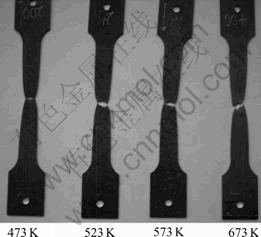 =0.25,温度T为473、523、573和673 K,试样尺寸为110 mm×10 mm×0.8 mm,拉伸后用电火花线切割机自断口附近取样,表面经研磨、抛光和腐蚀处理后,用光学显微镜观察微观组织。