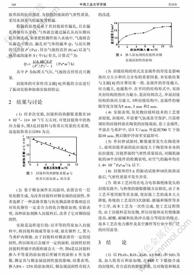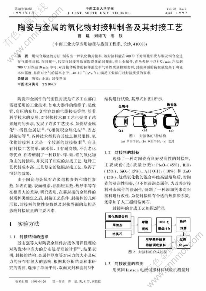 摘 要:用混合熔烧的方法,制备出一种氧化物 封接料.该封接料能在700℃下对氧化铝瓷与铜及铜合金进行气密性封接.在封接中,只需将封接料涂在陶瓷体的封接面,套上金属件,在马弗炉中以 5℃/min升温到700℃后保温10miN即可.对封接体所作的拉伸强度和气密性质量检测表明,封接界面的抗拉强度高于陶瓷本体强度,界面对空气的漏率 小于1.4×10-9Pa·m3/h,满足工业部门对封接质量的要求.