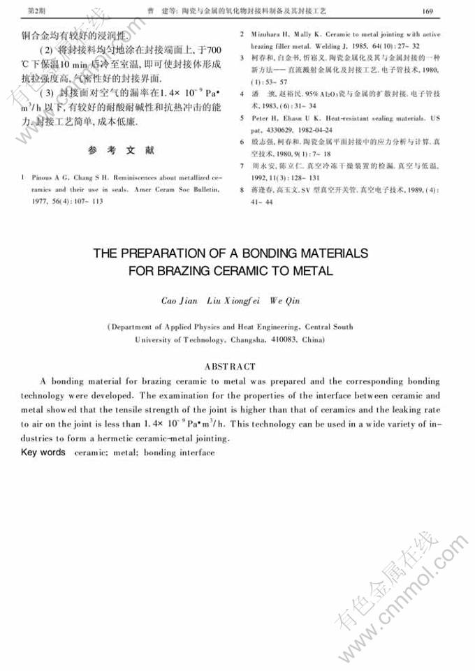 Abstract: A bonding material for brazing ceramic to metal was prepared and the corresponding bonding technology were developed. The examination for the properties of the interface between ceramic and metal showed that the tensile strength of the joint is higher than that of ceramics and the leaking rate to air on the joint is less than 1 4×10 -9 Pa·m3/h. This technology can be used in a wide variety of industries to form a hermetic ceramic metal jointing.