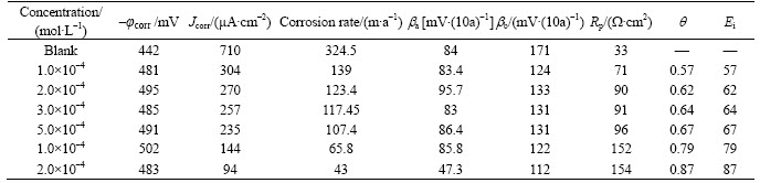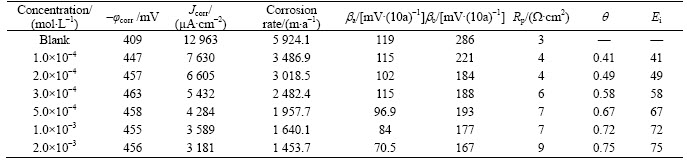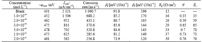 Table 1 Potentiodynamic polarization parameters for corrosion of mild steel in 1 mol/L HCl solution in absence and presence of different concentrations of 2-HBP at 25 °C