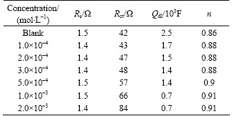 To obtain a satisfactory impedance simulation of steel, it is necessary to replace the capacitor (C) with a constant phase element (CPE) Q in the equivalent circuit. The most widely accepted explanation for the presence of CPE behavior and depressed semicircles on solid electrodes is microscopic roughness, causing an inhomogeneous distribution in the solution resistance as well as in the double-layer capacitance [28]. Constant phase element Cdl, Rs and Rct can be corresponded to double layer capacitance, solution resistance, and charge trasfer resistance, respectively. To corroborate the equivalent circuit, the experimental data are fitted to equivalent circuit and the circuit elements are obtained. Table 2 illustrates the equivalent circuit parameters for the impedance spectra of corrosion of steel in 1 mol/L HCl solution. The results demonstrate that the presence of 1×10–4– 2×10–3 mol/L inhibitor enhances the value of Rct obtained in the pure medium while that of Qdl is reduced. The decrease in Qdl is caused by adsorption of inhibitor, indicating that the exposed area decreases. On the other hand, a decrease in Qdl, which can result from a decrease in local dielectric constant and/or an increase in the thickness of the electrical double layer, suggests that Schiff base inhibitor acts by adsorption at the metal/solution interface.