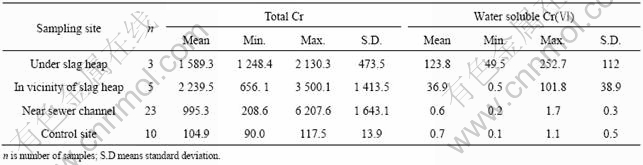 The contents of total Cr in topsoil at different locations are presented in Table 2. The contents of total Cr in soil show substantial variations according to the distance from the chromium slag site. The total Cr in soils under slag heap ranged from 1 248.4 to 2 130.3 mg/kg. The total Cr contents in soils near slag heap were in the range from 656.1 to 3 500.1 mg/kg, with the mean value of 2 239.5 mg/kg. The mean content of total Cr in the soils near the sewer channel was 995.3 mg/kg, ranging from 208.6 to 6 207.6 mg/kg. The total Cr in the soils of control site was from 90.0 to 117.5 mg/kg with minor variation.
