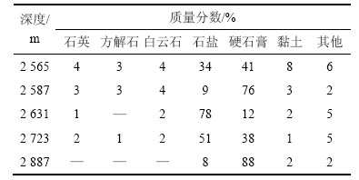 表1所示为AZ-2井复合盐层矿物组成,表2所示为MS-5井复合盐层矿物组成。利用D/max-IIIA X线衍射仪分析A&M油田复合盐层的矿物组成。由表1和表2可知:复合盐层以石膏和石盐为主,质量分数最高可分别达到90%和76%,含少量黏土矿物,以伊利石和伊蒙混层为主;随深度增加,岩性交替变化。地层中同时含有少量白云石、方解石和石英。