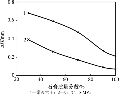 石膏遇水膨胀被认为是盐膏层井壁失稳的原因之一。选取AZ油田2 227 m地层岩屑,与硬石膏及下部泥岩按照不同比例混合,用NP-1页岩膨胀仪测常温常压膨胀率,用HTHP高温高压膨胀仪在95 ℃和8 MPa下测高温高压膨胀率。图2所示为混合岩样膨胀量随石膏质量分数的变化。由图2可见:随着石膏质量分数的增加,膏泥混合岩样的膨胀量明显降低。因此,膏泥岩中石膏吸水膨胀效应低于泥岩的膨胀效应,抑制复合盐层中的泥岩水化膨胀更为重要。结合石膏分散实验结果可知,膏泥岩地层井壁失稳的根本原因不只是石膏膨胀,而是石膏遇水膨胀、溶解,以及泥岩水化膨胀、分散的综合作用。