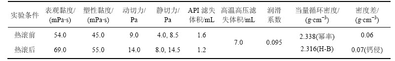 多元复合盐水钻井液的基本性能评价结果如表4所示。由表4可以看出:密度达到2.3 g/cm3的钻井液热滚前后塑性黏度均小于60 mPa·s,动切力控制在9~14 Pa,流变性优良;使用Drillbench软件,分别按照幂率和H-B 2种流变模式,算得该钻井液ECD分别为2.338 g/cm3和2.316 g/cm3,低于复合盐层最低破裂压力(2.35 g/cm3),表明多元复合盐水钻井液流变性优良,可有效控制当量循环密度。该钻井液API滤失量和高温高压滤失量(120 ℃, 3.5 MPa)很低,体现了其优良的滤失造壁性。使用固体、液体混合润滑剂,保证了钻井液具有良好的润滑性能。钻井液热滚后静置24 h,上下层密度差为0.06 g/cm3,受1% CaCl2污染后上下层密度差为0.07 g/cm3,表明该钻井液受钙侵后仍可保持良好的沉降稳定性,可防止因重晶石沉降引起溢流等问题。