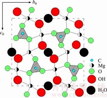 Figure 2 Crystal structure of Mg5(CO3)4(OH)2·4H2O