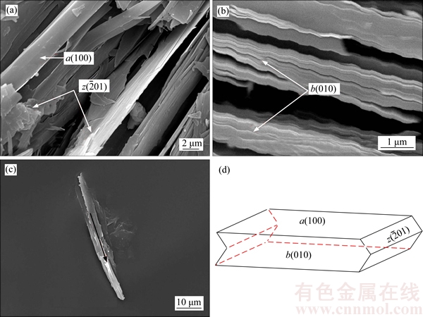 SEM images of the product obtained under the experimental conditions are shown in Figures 3(a)–(c). It can be seen from the SEM images that the Mg5(CO3)4(OH)2.4H2O is made from a tiny single crystal in plate shape. According to the crystal habit, the visible crystal faces of plate crystal are a(100) and b(010). In addition, combination of the relationship between crystal faces, it can be inferred the crystal side is z(201). And the crystal plane diagram of the plate-like Mg5(CO3)4(OH)2.4H2O is drew as shown in Figure 3(d).