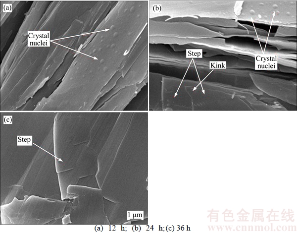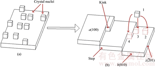 Figure 5 shows the SEM images of the products obtained at 12, 24, 36 h of duration. When the reaction time is 12 h, lots of “two-dimensional crystal nuclei” form on the interface (Figure 5(a)). As the reaction continues, a large number of crystal nuclei assemble and grow along the steps (Figure 5(b)). After 36 h, due to the decreasing supersaturation of solution system, the nucleation rate is less than the growth rate of crystal. The crystal surface becomes much smoother gradually and then grows completely (Figure 5(c)). We preliminary refer to this process as “step growth” (Figure 6). At first, crystal nuclei begin to form in supersaturated solution (Figure 6(a)). With the further reaction, Mg5(CO3)4(OH)2·4H2O at site 1 arrives in interface at site 2. Simultaneously, one nearest-neighbor bonds and four next nearest- neighbor bonds would be originated. If the bonding energies of the nearest-neighbor and the next nearest-neighbor molecules are 2φ1 and 2φ2 [25], then the crystallization release energy (ws: thermodynamics driving force) is WS=2φ1+8φ2. Similarly, the energies released at site 3 and at kinking site 4 are calculated according to the formula WS=4φ1+12φ2 and WS=6φ1+12φ2, respectively. Thus, the kinking site 4, the largest the driving force, has the minimum potential energy. That is to say, the kinking site 4 is the most stable site where molecules are absorbed on the interface location. When Mg5(CO3)4(OH)2·4H2O arrive in the kinking site through the diffusion, the crystal will grow gradually. The kink stops growing after sweeping the crystal plane b(010). Finally, the crystal plane a(100), b(010) and the coarser crystal plane
