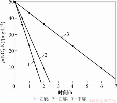 不同电子供体下反硝化速率与反硝化之后粒径的变化见表2。由表2可见:反硝化状态下碱度分别由40 mg/L 增加到 252,248和244 mg/L可以断定异养反硝化反应的发生。反硝化过程相对于硝化过程污泥粒径稍微有所减小,这是由于在低氧状态下会发生部分菌体脱离菌胶团,导致絮体的解体与破坏。图3所示为NO3--N随着时间的变化情况。由图3可知:以乙酸为电子供体时反硝化试验可在2 h内完成,其反硝化速率为13.8 mg/(g·h),以乙醇为电子供体时为10.2 mg/(g·h),以甲醇时最小为3.4 mg/(g·h)。这是由于乙酸代谢途径简单,可以通过β-氧化可直接转化为乙酰辅酶A 进入三羧基酸(TCA)循环[9]。Peng等[10]在不同温度下的研究表明:采用乙酸为碳源时的反硝化速率要高于乙醇,甲醇最小。