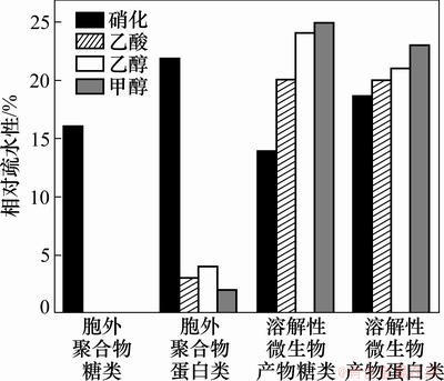 图4 胞外聚合物与溶解性微生物产物在硝化与反硝化状态下的相对疏水性