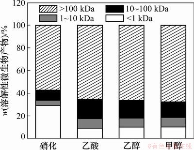 图5所示为在硝化与反硝化状态下SMP相对分子质量分布的情况;其中硝化污泥SMP整体分布以双峰状态存在,即以>100 kDa和<1 kDa的相对分子质量主要存在,分别占29.3%和57.3%。经过反硝化之后,3种电子供体下<1 kDa的溶解性生物产物质量分数均有所降低,降到10%左右;该3种电子供体下的SMP相对分子质量分布较相似,在反硝化污泥产生的SMP中相对分子质量较大的(>100 kDa)溶解性生物产物成为SMP的主要组成,占到66%左右。McAdam等[11]在考查底物对缺氧MBR的膜污染特性研究发现,以乙酸和乙醇底物下产生的SMP的相对分子质量分布同样以双峰态存在,其中以乙酸、乙醇为碳源时,SMP中的相对分子质量>100 kDa和<10 kD的溶解性生物产物质量分数分别达到43.17%,32.5%和 68.5%,14.2%。这也许是由于反应器运行条件不同造成微生物种群结构的差异而引起SMP分布结果的差异。