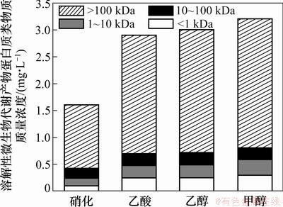硝化与反硝化中溶解性微生物产物中糖类相对分子质量分级如图6所示。由图6可见:在硝化与反硝化过程中SMPc的相对分子质量分布中主要以>100 kDa的物质存在,反硝化过程中以乙酸为电子供体时,SMPc量较硝化状态时略微降低,而以甲醇时反硝化的污泥较硝化状态下时的SMPC质量浓度增加了3 mg/L。由图7可见:硝化污泥产生的SMPP质量浓度比反硝化污泥产生的低,这是由于SMPP在好氧条件下易于降解。高溶解氧浓度会增加絮体的形成,好氧条件下细菌的代谢对于保持强聚集力起到重要的作 用[12]。硝化污泥与反硝化污泥产生的SMPP的相对分子质量也是主要以>100 kDa的物质存在。其中反硝化污泥产生的SMPP在相对分子质量<1 kDa,1~10 kDa及>100 kDa的物质较硝化污泥产生的SMPP均有所增加,其中<1 kDa和>100 kDa的物质增加了约2.5和3倍。甲醇为电子供体时,反硝化污泥产生的SMPP质量浓度较硝化污泥中的增加了1倍,乙酸增加约80%,乙醇居中。在高碱度下和在反硝化过程中的疏水性的蛋白质会引起在过滤试验当中的过滤阻力。Kelly等[13-14]的研究表明随着蛋白质贮存速度随着pH的增加会引起BSA的聚集速度,蛋白质的聚集对于蛋白质的污染起到重要的作用;初始通量的降低由于较大的BSA聚集体在膜表面的沉积,并会用作为膨胀蛋白质沉积的附着地。
