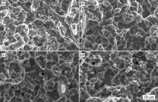 (b). They are all characterized by dimples with the character of plastic yield. This is because the AZ91D die-cast consists of α-Mg and β-Mg17Al12 phases. When the external stress acts on the material, the combining powder of the interface between primary α-Mg and β-Mg17Al12 is reduced. The strain at the interphase is produced, which causes the deformation of microstructure. Then, at the interphase some cavities are produced. After that, the coupled two phases at the interphase slide and the cavities begin to expand until the adjacent cavities meet each other. Eventually, the adjacent cavities integrate together and the coupling interphase is cracked. Meanwhile on the each side of the fracture texture, a strait shape of dimple face appears on the surface.