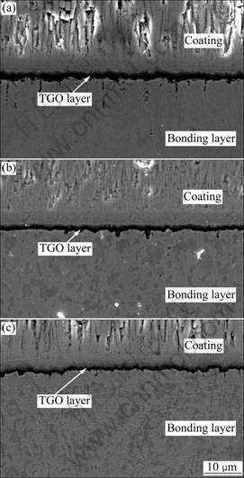 A TGO layer is found between the ceramic and the bonding layers of TBCs after 15 cycles of oxidation at  1 050℃ for 1 h. For the original TBCs, the columnar grain structures of the ceramic layer become loose after 15 cycles, and the thickness of the TGO layer is about  2 μm. In many locations, fingerlike oxides irregularly extending towards the bonding layer are observed in Fig.6(a). However, the thickness of the TGO layers formed in the irradiated TBCs is reduced to a certain extent. The fingerlike oxide is found only in few locations of the bonding layer of TBCs irradiated at 100 A/cm2 with 1 shot, as shown in Fig.6(b). The thickness of the TGO layer of the TBCs irradiated at 200 A/cm2 with 1 shot is the minimum, and there is no fingerlike oxide in the bonding layer, as shown in Fig.6(c). The results of these observations are in good agreement with the cyclic oxidation kinetic curves shown in Fig.5. When the HIPIB current density reaches 200 A/cm2, the surface of the TBCs melts due to ablation, and the gaps among the columnar grains are filled and blocked. Therefore, the oxygen cannot diffuse towards the bonding layer and the oxidation is reduced. Consequently, the HIPIB irradiation improves the cyclic oxidation behavior of the TBCs.