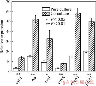 图1 在第32 h时A. ferrooxidans纯培养、混合培养铁氧化相关基因表达量的比较[9]
