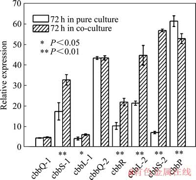 图2 在第72 h时A.ferrooxidans纯培养、混合培养CO2固定相关基因表达量的比较[9]