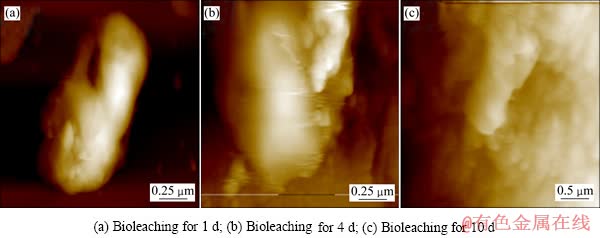 曾伟民[22]采用AFM考察黄铜矿精矿生物浸出过程中吸附微生物产生胞外多聚物的过程,如图4所示,生物浸出第1 d,浸矿微生物吸附到矿物表面,细胞表面有少量的胞外多聚物形成;生物浸出第3 d,吸附微生物开始不断产生胞外多聚物,在包裹微生物本身之后,开始向矿物表面延伸;生物浸出第6 d,胞外多聚物的生成量大大增加,不仅完全包裹了微生物自身,而且覆盖了微生物的生长区域。据报道[23-24],吸附微生物可以通过胞外多聚物富集溶液中的Fe3+,从而加速矿物的溶解。