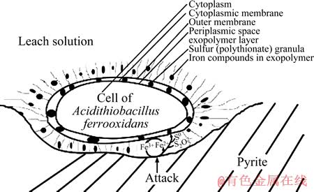 Fig. 5 Contact mechanism model of leaching pyrite by A. ferrooxidans[25]