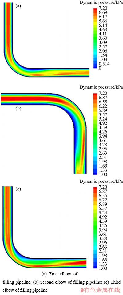 从图2可知,料浆在管道中动压变化情况为在竖直以及水平管道中,最大动压出现在管道中心处,而经过弯管处时最大动压向外侧管壁处偏移,所以,弯管处的管道磨损较为严重。