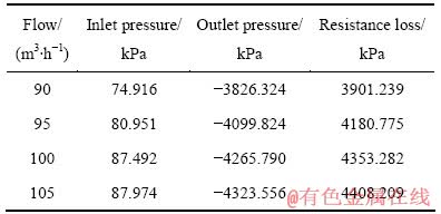 为了分析同一浓度时不同流量下管道阻力损失情况,选用料浆浓度为78 %,流量分别为90、95、100和105 m3/h时对应的管道损失,其数值模拟结果列于表6。从表6中可以看出,随着流量的增加,管道阻力损失逐渐增大,在流量90 m3/h时,损失最小。