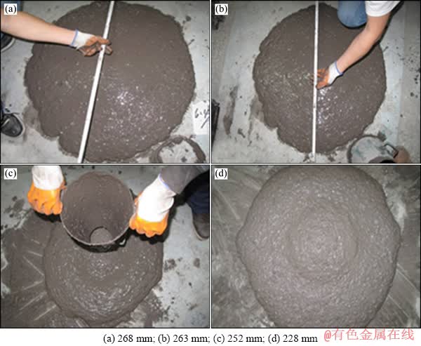 坍落度试验反映料浆在自重作用下克服剪切阻力所产生的变形能力。坍落度是一项综合性的定量指标,料浆的流动性、保水性和粘聚性是料浆的定性表现,可以说坍落度是料浆内在质量的外在表现,坍落度不满足要求会直接影响到泵送甚至影响到充填质量,因此对坍落度的控制就十分重要,邓代强等[23]的研究表明:粗骨料充填料浆当坍落度在230~275 mm范围内,可基本满足自流输送要求,在实验室进行废尾比6:4的料浆坍落度试验(见图4),并将结果列于表8中。