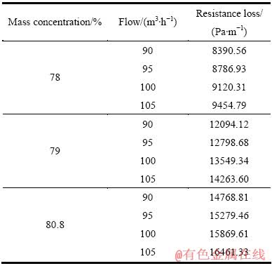 从表9可以看出,在同等浓度下, 随着流量的增加,沿程阻力损失也在增加,流量为90 m3/h时阻力损失最小;在同等流量时,浓度越大,阻力损失越大,与模拟结果一致,这也验证了模拟的正确性。