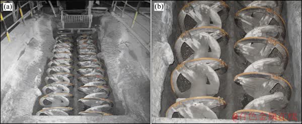 金川充填系统的主搅拌为ATDⅢ-Ф700型双螺旋搅拌输送机(如图5),搅拌轴长达6 m,设计搅拌槽的最大容积为5 m3,设计生产能力为36~90 m3/h,采用两个30 kw电机传动。
