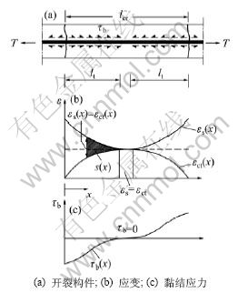 在初始开裂阶段(裂缝间距lcr较大,一般lcr>2lt),两裂缝间有一定区域的混凝土和钢筋应变相等,该区域不存在黏结应力τb和滑移(见图1(c));随着外部荷载的增大,经过一定的传递长度可使该区域混凝土的拉应力达到抗拉强度,此时第2条(批)裂缝出现了。当所有的裂缝间距均小于2lt后,裂缝开展便达到稳定状态。