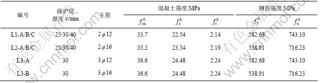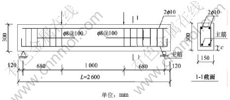 以保护层厚度、钢筋配筋率以及钢筋直径为主要参数,设计制作了8根HRB500级钢筋混凝土梁;受压构造钢筋均采用直径10 mm的HPB235级钢筋(计算时可不考虑受压钢筋影响),试件构造见图5。试验梁混凝土设计强度等级均为C30,试件参数和材料力