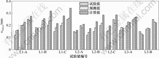 在0.45~0.70之间时,在各级荷载步作用下(对L2-A和L2-C梁测读2个荷载步,对其余梁测读3个荷载步),试验梁的短期最大裂缝宽度试验值、模型预测值以及规范公式计算值的比较如图6所示。