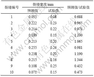 =0.619)钢筋水平位置处各条裂缝的预测宽度和试验宽度的比较。由表2可知:梁纯弯段内较宽裂缝(2~8号裂缝)的预测值与试验值较吻合,两者比值的均值为1.103,变异系数为0.122 3;而对于纯弯段外较细小的斜裂缝,则相对偏差较大,这说明黏结-滑移理论不适用斜裂缝宽度的计算。按照规范的裂缝控制要求,梁内较宽的裂缝往往为主要研究对象;对于这些裂缝,数值模型的预测精度是能满足要求的。