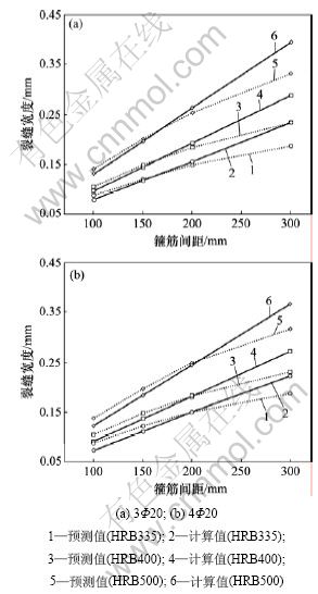 从图7可以看出:当箍筋间距分别取为100,150和200 mm时,对于配置3根和4根直径为20 mm的HRB335,HRB400和HRB500钢筋混凝土模型梁,裂缝宽度数值预测结果与按式(14)的计算结果较符合;当箍筋间距增大到300 mm时,模型预测结果则偏小。考虑到实际配箍梁,裂缝间距通常在100~200 mm范围内,此时,预测值与计算值比值的均值为1.050,变异系数为0.06。可见:模型的应用效果是非常理想的。同时,从另一方面也可以看出:我国规范公式中关于平均裂缝宽度的计算方法是可行的,是建立在黏结-滑移理论基础上的。