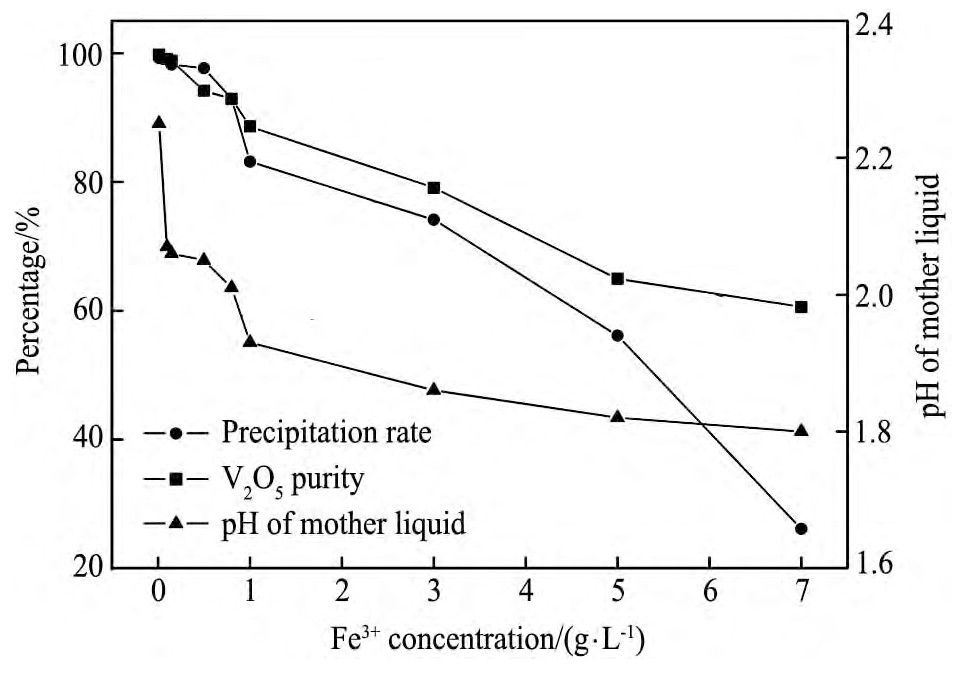 图1 不同Fe3+离子浓度对沉钒率、V2O5产品纯度、沉钒母液p H的影响Fig.1Impact of different Fe3+concentrations on vanadium precipitation rate,V2O5product purity and p H of mother liquor
