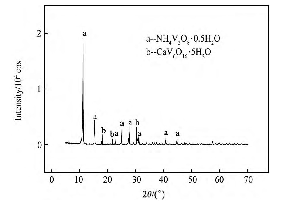 图5 Ca2+离子浓度为1.06 g·L-1L的富钒液沉钒所得APV产品XRD分析Fig.5 XRD pattern of APV from vanadium precipitation by va-nadium-rich liquid with 1.06 g·L-1Ca2+