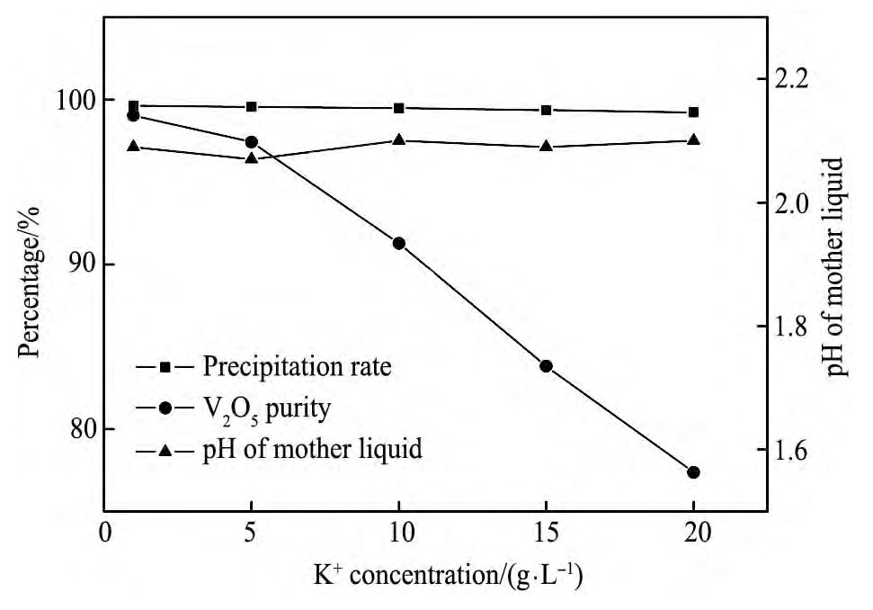 图6 不同K+离子浓度对沉钒率、V2O5产品纯度、沉钒母液p H的影响Fig.6 Impact of different K+concentrations on vanadium pre-cipitation rate,V2O5product purity and p H of mother liquor