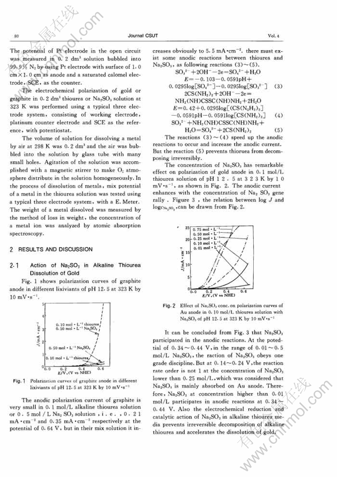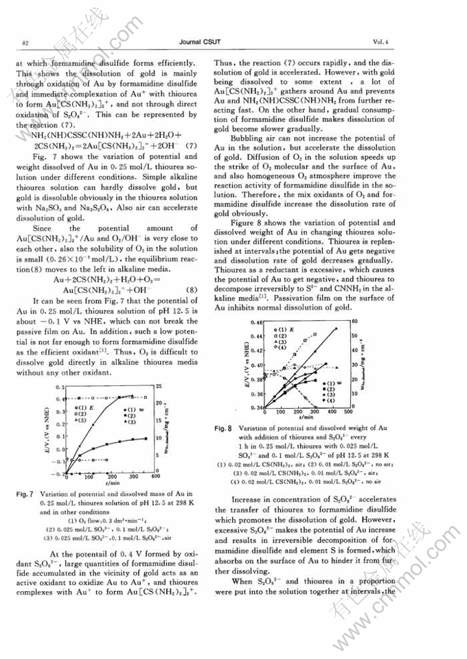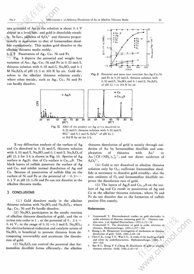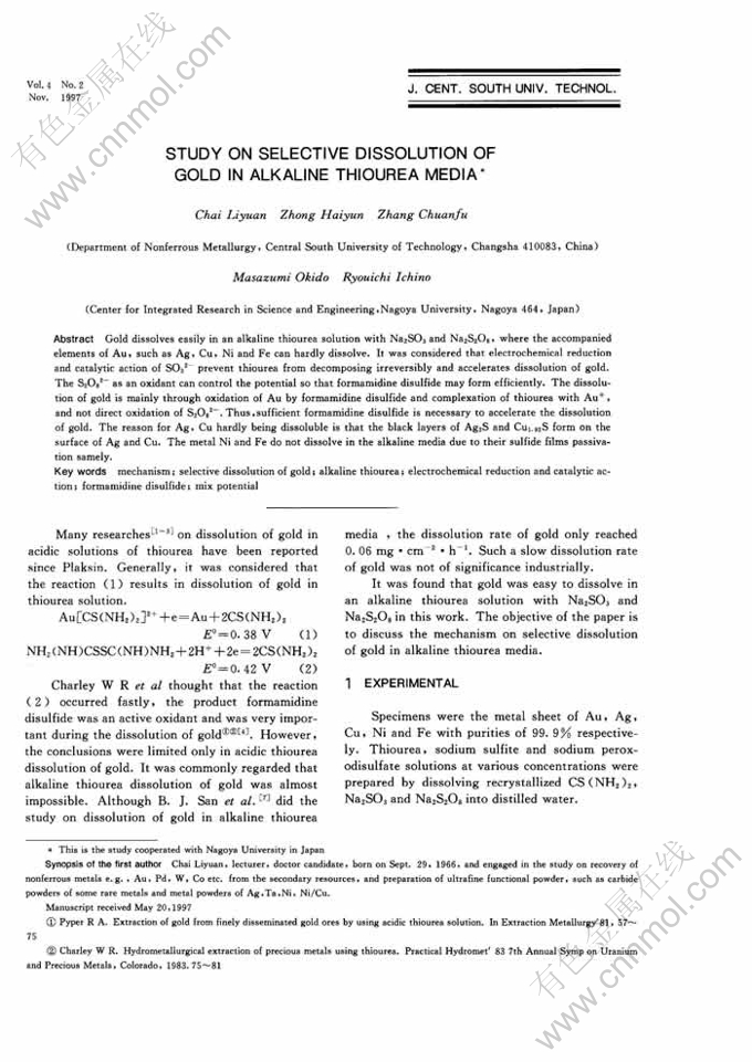 Key words:mechanism; selective dissolution of gold; alkaline thiourea; electrochemical reduction and catalytic action; formamidine disulfide; mix potential