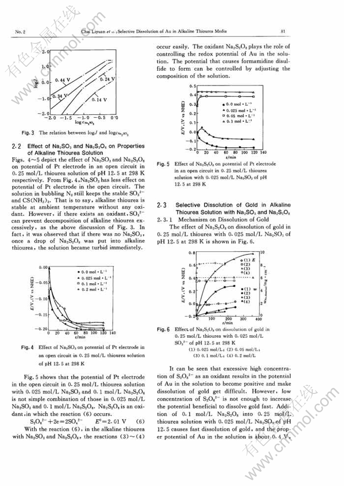 Abstract: Gold dissolves easily in an alkaline thiourea solution with Na2SO3 and Na2S2O8, where the accompanied elements of Au, such as Ag, Cu, Ni and Fe can hardly dissolve. It was considered that electrochemical reduction and catalytic action of SO32- prevent thiourea from decomposing irreversibly and accelerates dissolution of gold.The S2O82- as an oxidant can control the potential so that formamidine disulfide may form efficiently. The dissolution of gold is mainly through oxidation of Au by formamidine disulfide and complexation of thiourea with An+,and not direct oxidation of S2O82-. Thus,sufficient formamidine disulfide is necessary to accelerate the dissolution of gold. The reason for Ag, Cu hardly being dissoluble is that the black layers of Ag2S and Cu1.92S form on the surface of Ag and Cu. The metal Ni and Fe do not dissolve in the alkaline media due to their sulfide films passivation samely.