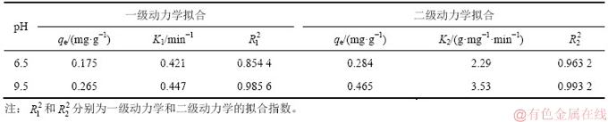 ,说明氟碳铈矿吸附辛基羟肟酸OHA更符合二级动力学模型;pH=9.5时氟碳铈矿吸附辛基羟肟酸的二级动力学拟合吸附速率常数(3.53)大于pH=6.5时吸附速率常数(2.29),说明pH=9.5时,辛基羟肟酸OHA在氟碳铈矿吸附更快。