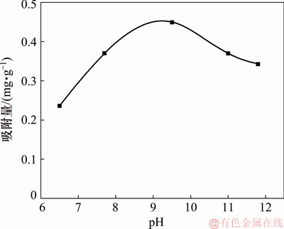 图2所示为辛基羟肟酸OHA质量浓度为159.23 mg/L、温度为25 ℃、吸附时间为15 min时,pH对氟碳铈矿吸附辛基羟肟酸OHA的影响。由图2可知:当pH小于9.5时,随pH升高,辛基羟肟酸OHA在氟碳铈矿表面吸附量增大;当pH大于9.5时,随pH升高,辛基羟肟酸OHA在氟碳铈矿表面吸附量减小。当pH=9.5时,辛基羟肟酸在氟碳铈矿表面吸附量最大。分析认为,随pH增大,辛基羟肟酸解离程度大,溶液中辛基羟肟酸根离子含量增加,从而增大其在氟碳铈矿表面的化学吸附;而pH过高(pH>9.5)时,矿物表面电负性增强,由于静电斥力而阻碍辛基羟肟酸阴离子在矿物表面的吸附,导致辛基羟肟酸在氟碳铈矿表面的吸附量减小。