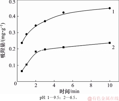 图3所示为辛基羟肟酸OHA质量浓度为159.23 mg/L、温度为25 ℃时,在pH为6.5和9.5条件下,氟碳铈矿对辛基羟肟酸OHA吸附量随时间的变化曲线。由图3可知:随吸附时间增加,辛基羟肟酸吸附量逐渐增加,吸附时间为10 min时,氟碳铈矿吸附辛基羟肟酸OHA趋于平衡。