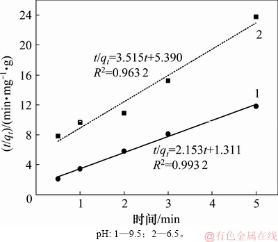 图4和图5所示分别为辛基羟肟酸OHA质量浓度为159.23 mg/L、温度为25 ℃时,在pH为6.5和9.5条件下,氟碳铈矿吸附辛基羟肟酸的一级动力学拟合和二级动力学拟合结果,拟合参数见表1。由表1可知:拟合指数