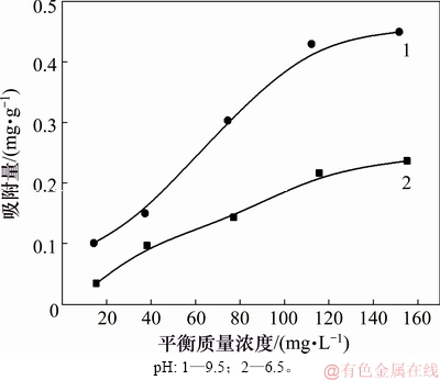 图6所示为pH分别为6.5和9.5、温度为25℃时,氟碳铈矿对辛基羟肟酸OHA吸附量随浓度的变化曲线。由图6可知:随辛基羟肟酸OHA质量浓度的增加,氟碳铈矿对辛基羟肟酸OHA吸附量随之增大;pH=9.5时,辛基羟肟酸OHA在氟碳铈矿表面吸附量随辛基羟肟酸OHA质量浓度的增加而增大的趋势更明显,说明溶液pH为9.5时较pH为6.5时更有利于辛基羟肟酸OHA在氟碳铈矿表面的吸附。