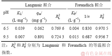 ,说明氟碳铈矿吸附辛基羟肟酸符合Freundlich等温吸附方程,辛基羟肟酸OHA在氟碳铈矿表面的吸附是多层、不均匀吸附,即同时存在物理吸附和化学吸附。Freundlich方程中非线性指数1/n反映吸附质吸附位点能量分布特征,吸附常数KF反映吸附能力的强弱,KF越大,吸附能力越大;1/n越小,吸附强度越大[27]。由表2可知:氟碳铈矿在pH=9.5时吸附辛基羟肟酸OHA能力优于pH=6.5时的吸附能力。