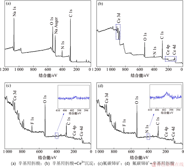图12 辛基羟肟酸、辛基羟肟酸铈沉淀物及辛基羟肟酸作用前后氟碳铈矿XPS全谱